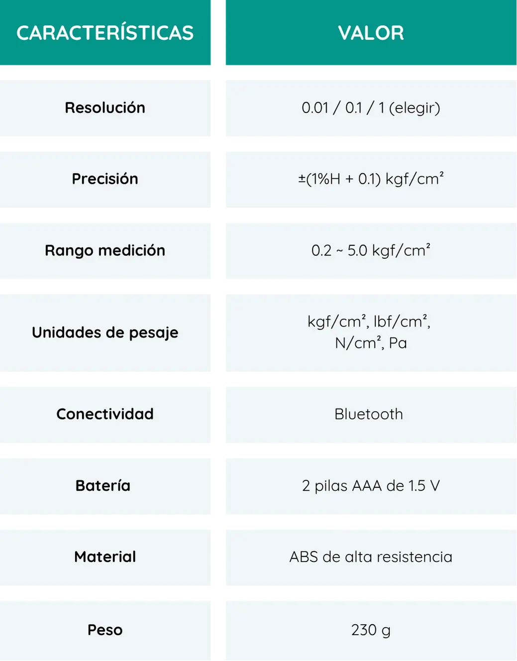 Lecturas estables en segundos con rango de 0.2 ~ 5.0 kgf/cm², precisión ±(1%H + 0.1) y punta apta para distintos tipos de frutas.
