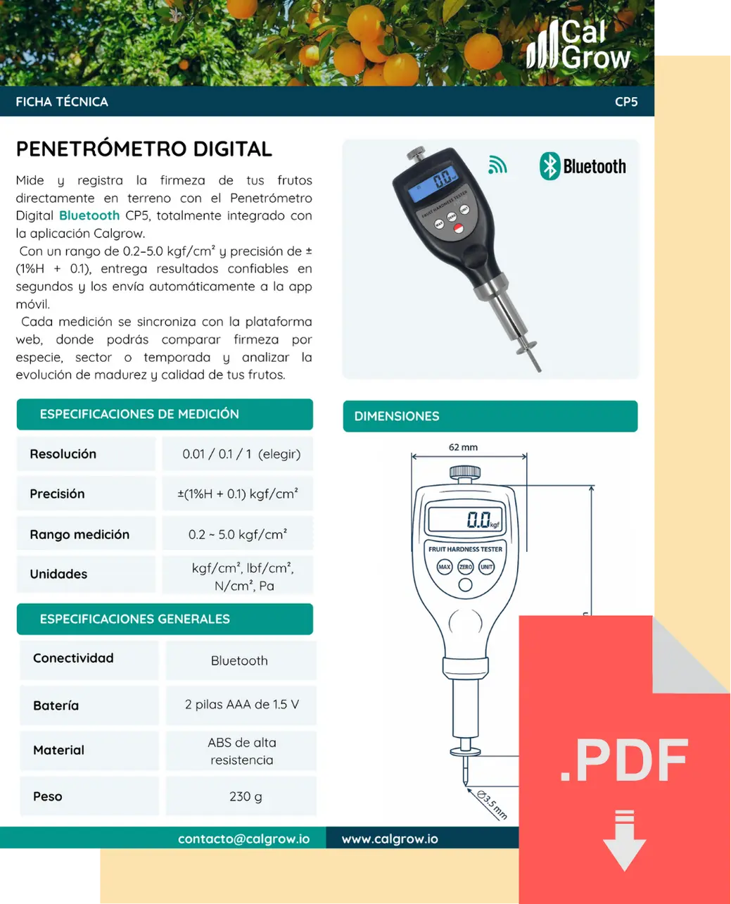 El penetrómetro digital Bluetooth modelo CP5 es la herramienta ideal para registrar con precisión la firmeza de tus frutos en terreno o postcosecha.
